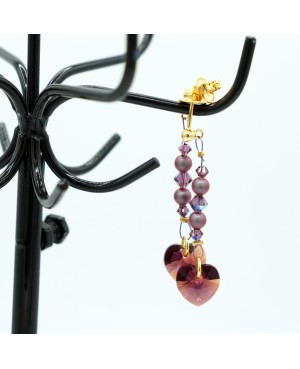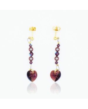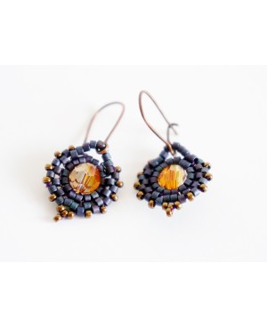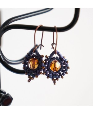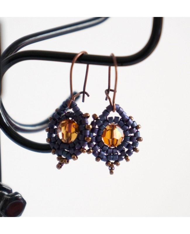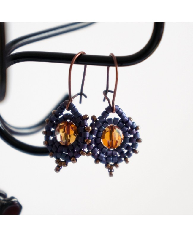 Discrète par leur taille mais originale par leur forme, ces magnifiques boucles d'oreilles ont été réalisées avec des perles tissées. Le centre est constitué d'une perle orange en cristal de Swarovski autour de laquelle sont sertis des délicas violets et des rocailles bronze.