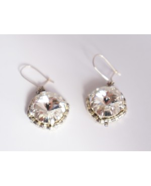 A la recherche d'un cadeau original? Ces boucles d'oreilles feront un cadeau exceptionnel et à petit prix. Leur centre est en cristal transparent (reflet argenté) et est serti de petites perles argentées. Elles ont été réalisées à la main de manière artisanale. Plusieurs variantes de ce modèle sont possibles : centre doré, bleu, etc