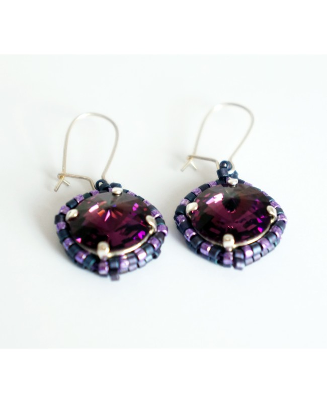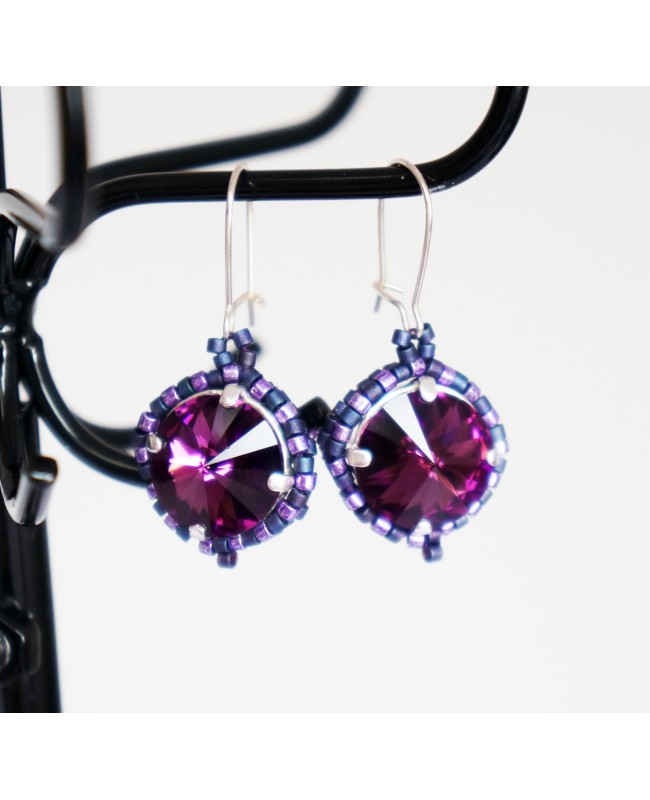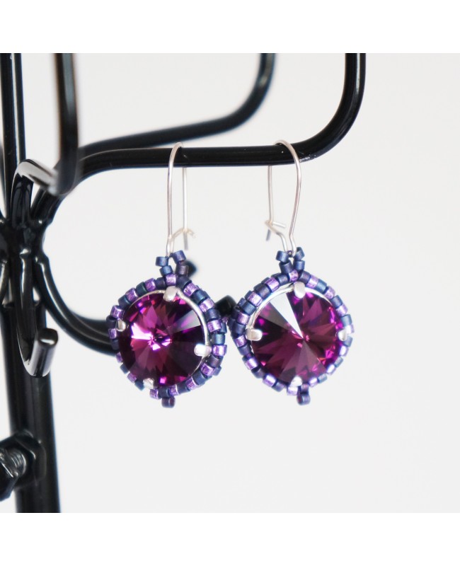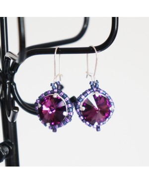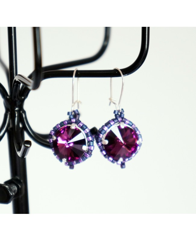 Réalisées à partir de petits cabochons de Swarovski ronds et violets de 12 mm, ces boucles d'oreilles sont simples, sobres, classes et faciles à porter. C'est l'accessoire idéal qui s'accordera à toutes vos tenues. Une touche d'originalité a été apportée grâce aux petites perles violettes et roses.