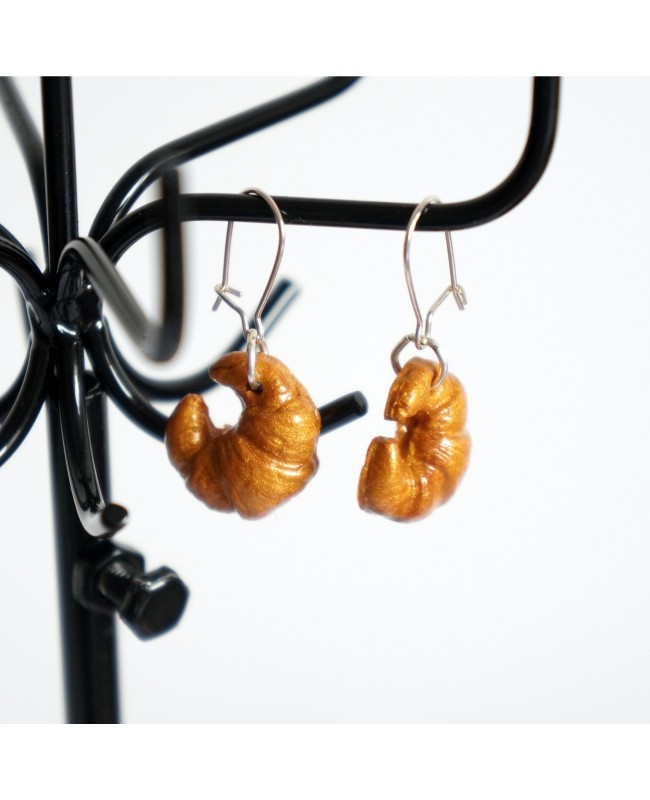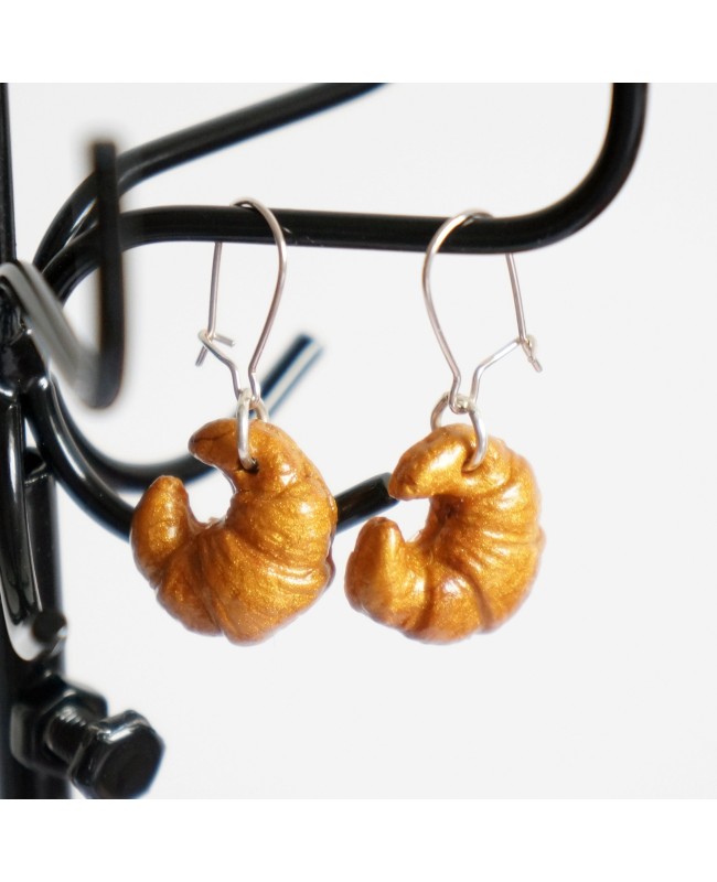 Ces boucles d'oreilles gourmandes représentent des petits croissants qui ont été réalisés en polymère. Le support des boucles d'oreille est en métal argenté. Les croissants ont été réalisés à la main à partir de pâte polymère dorée et ont une longueur de 1,5 cm. Elles sont donc petites, légères et faciles à porter.