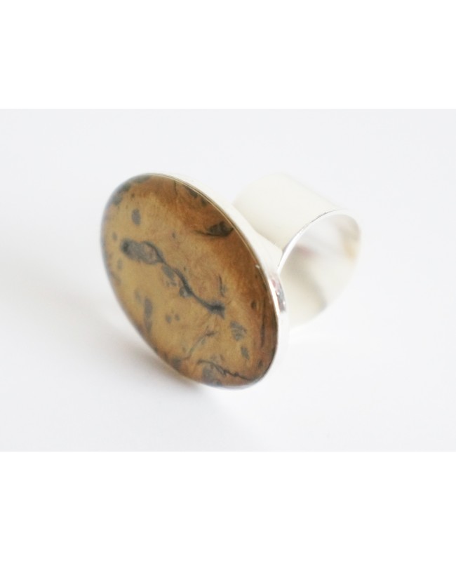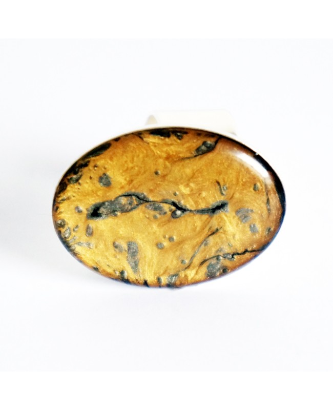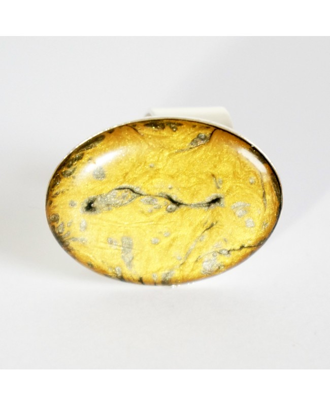 Cette bague a été réalisée à partir d'un support métallique argenté qui est ajustable. Sur la base de ce support, nous avons posé de la peinture argentée et dorée puis de la résine. Tous nos bijoux sont réalisés par nos soins, à la main. Les effets de la peinture sont aléatoires et il nous est impossible de fabriquer 2 bijoux identiques. De plus, la peinture est irisée et la couleur change en fonction de la luminosité.