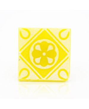 This square fancy ring, yellow with a faux ceramic look, measures 2.5 cm on each side. It is handmade from polymer clay. Its silver-plated metal band can be adjusted to fit your finger size.