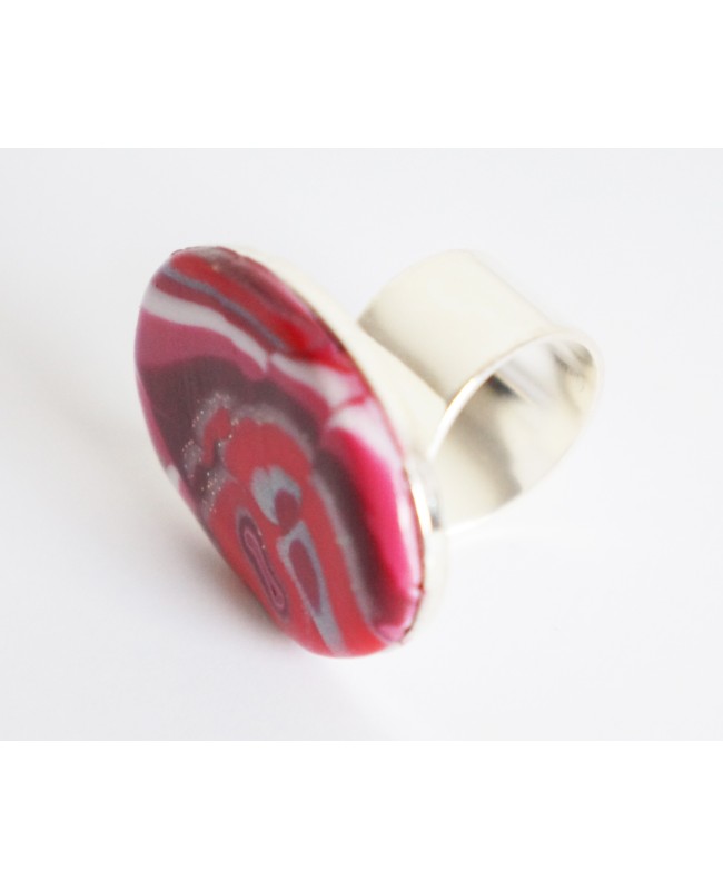 Cette bague fantaisie a été réalisée partir de pâte polymère blanche, rose, rouge et argentée. La pâte polymère est une pâte à modeler qui durcit lors de la cuisson. Le cabochon de cette bague est donc solide et résistera au temps. Il a été fixé sur un support de bague argenté.