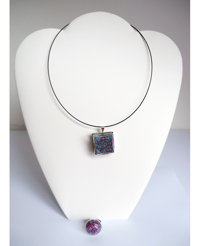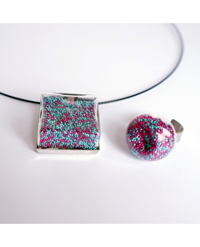 Si vous aimez assortir vos bijoux, vous aimerez cette parure constituée d'une bague ajustable et d'un pendentif carré. Ces bijoux fantaisie sont constitués de supports argentés, de dôme en verre et de microperles. L'originalité de cette parure de bijoux fantaisie est dans l'association de microperles aux couleurs vives et opposées : le turquoise et le rose.