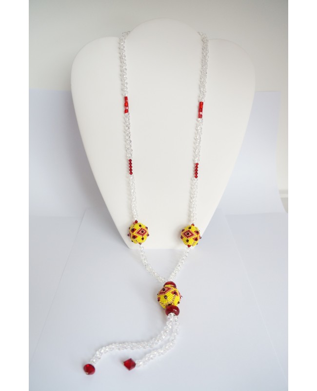 Sautoir jaune, rouge et transparent. Perles tissées faites main
