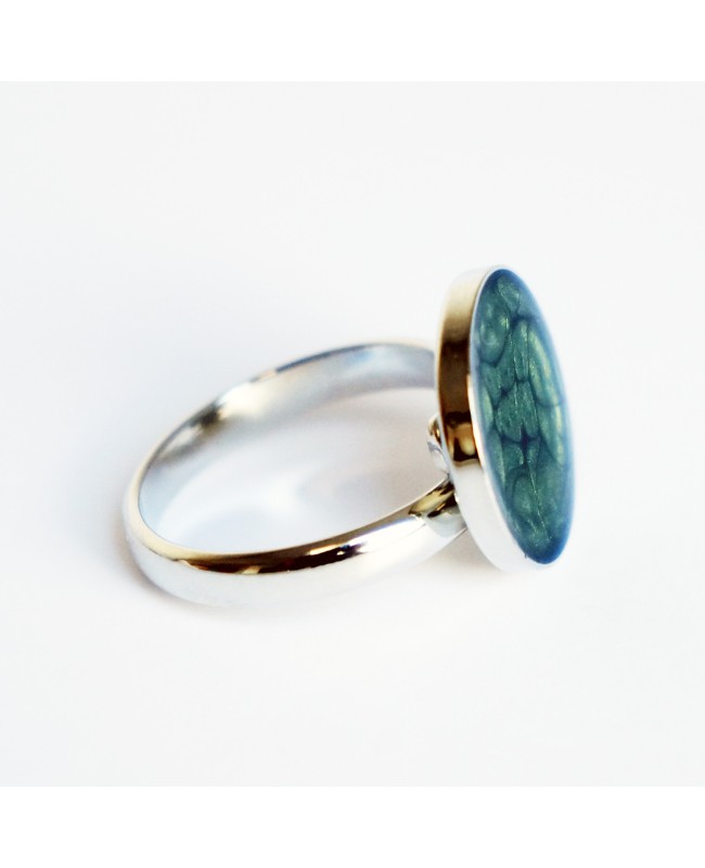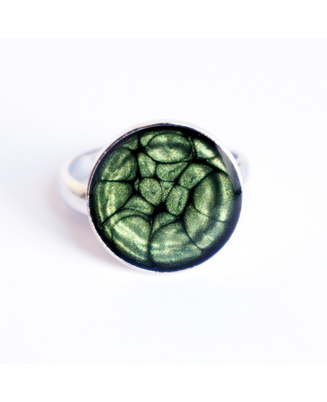 If you like small jewels discreet and original, you will appreciate this small green ring created from paint and resin. Support is adjustable and the red part is handmade. Diameter of the top is 15 mm/0.59 inch.
