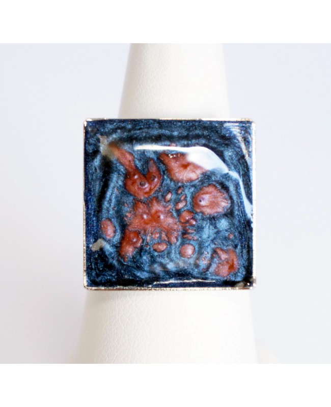 This beautiful square ring was made in our workshop with pink and blue paint. Thanks to its adjustable silver ring, this piece will fit perfectly to the size of your finger.
