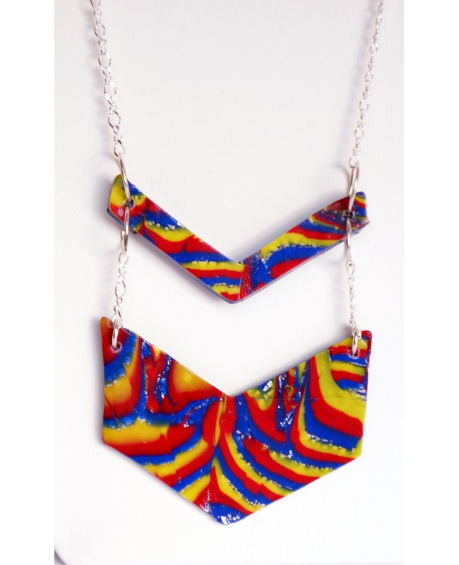 This long necklace is made up of individually handmade pieces. The flat blue, red and yellow beads are made by us from polymer clay in our workshop. A silver-colored chain joins the pieces together.