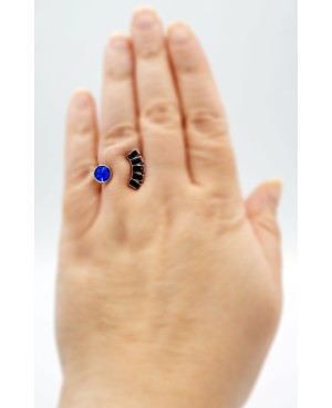 Originality and class are the magic words for this adjustable ring made from navy blue and black Swarovski crystals. It measures 25mm wide and you will love the subtlety of its colors and the shine of the crystal. The little blue spinning tops reveal a bluey-green sparkle under the light.