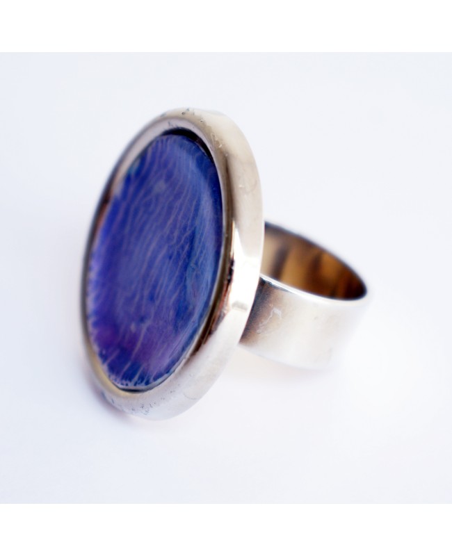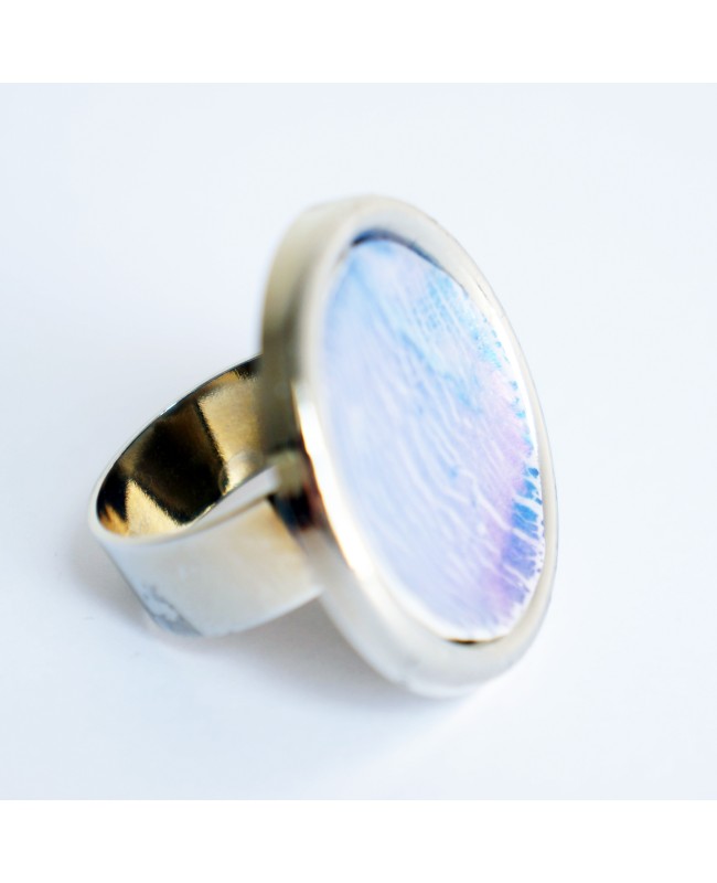 Whether for yourself or as a gift, this large ring will have the “wow” factor thanks to its metallic shimmer that appears in the light. With a diameter of 3cm, the stone of this ring was made in our workshop, from polymer clay with silver leaf and pink and purple inks. This ring is adjustable and can adapt perfectly to your size.