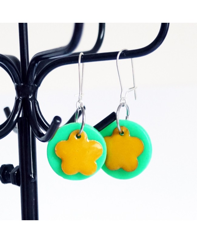 Simple and cheerful, these green-and-yellow earrings are very lightweight. The green disc has a 0.78in (2cm) diameter and is made of polymer clay. The tiny yellow flower is an enameled trinket. The assembly was handmade in our workshop. Including the base, this jewel is 1.38in (3.5cm) long.