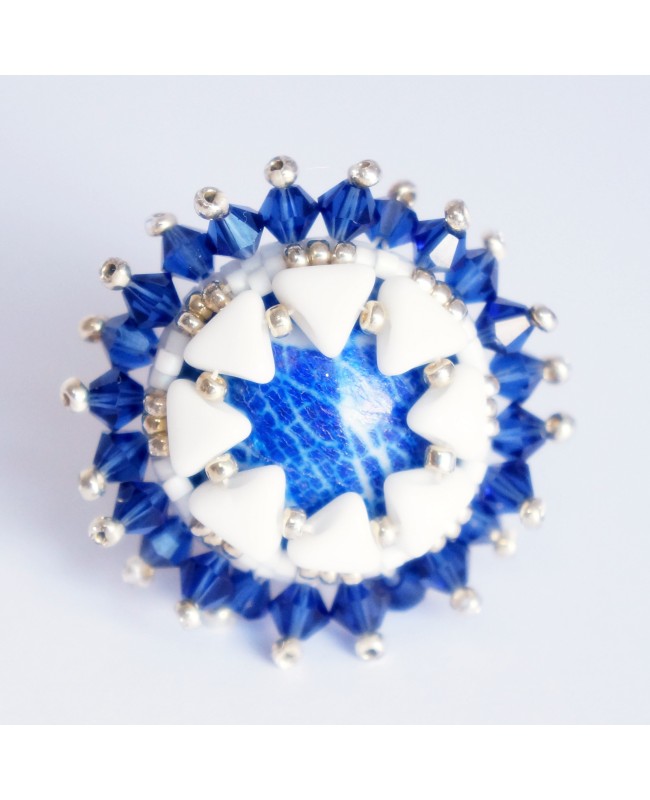 Want a standout ring? This modern, original and baroque style ring will make you happy! Why? First, because of its size! The diameter is 1.26in (32mm). The center of the cabochon, is handmade of polymer clay and crimped with pearls in seed beads, glass and Swarovski crystal. The ring is adjustable.