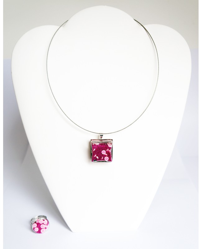 The square pendant measures 2.5 cm across. It can be worn as a choker thanks to its 45 cm cord. The ring is round and has a diameter of 22 mm. The upper part is fixed to a silver-plated support with an adjustable band. No more sizing problems with this ring which adjusts perfectly to your finger and you can even swap hands!
