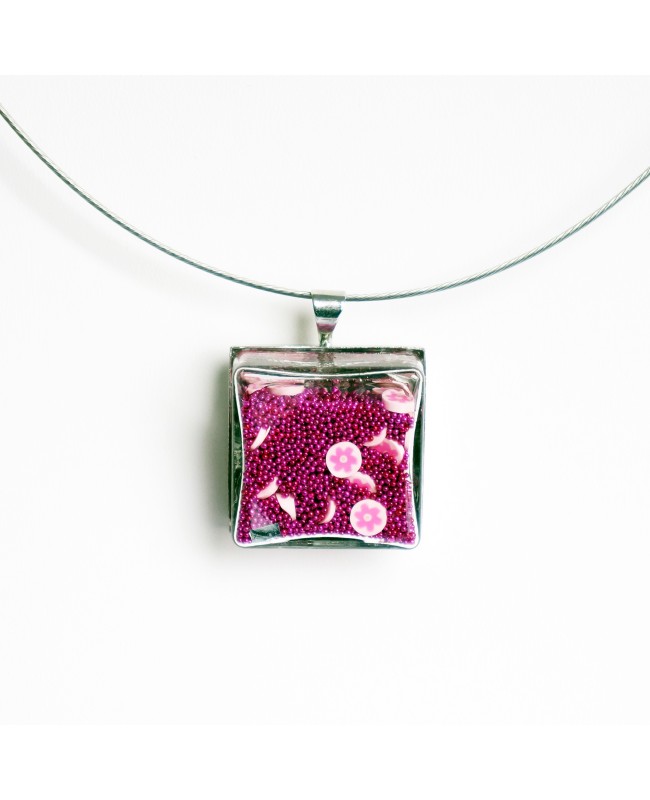 This pendant and ring feature glass vials filled with microbeads and little pink flowers. The flowers are made from polymer clay.