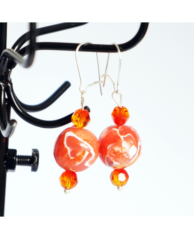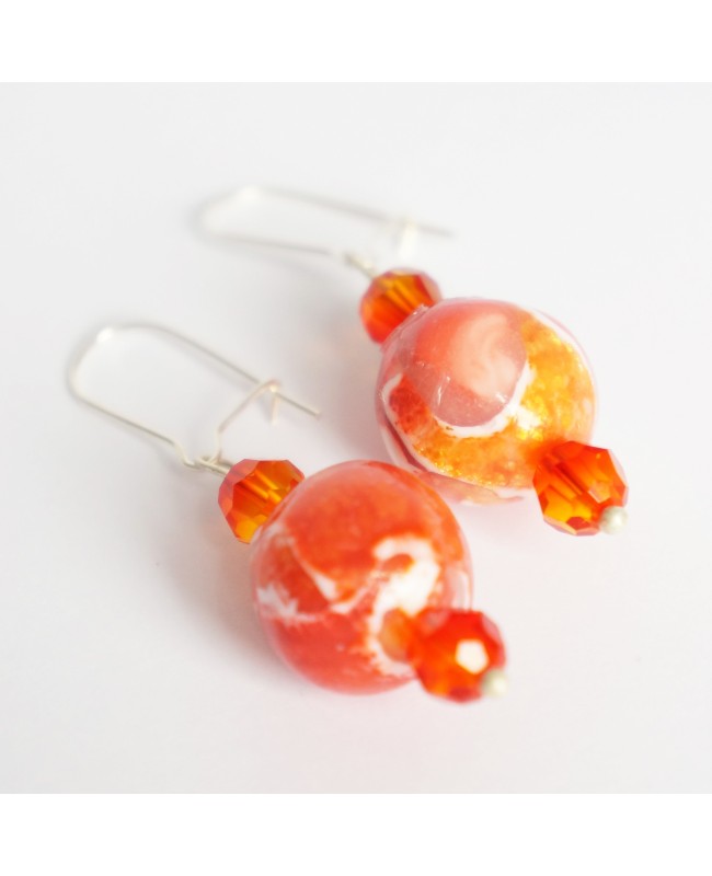 These orange earrings will be loved by those looking for color and originality. The orange beads were made in our workshop and are unique. They were made with polymer clay, silver leaf and inks. They reflect their colors in an original and incomparable way. And for a shimmer that is even more precious, the handmade beads are surrounded by Swarovski crystal beads. To finish, everything is fixed to stainless steel earring supports.