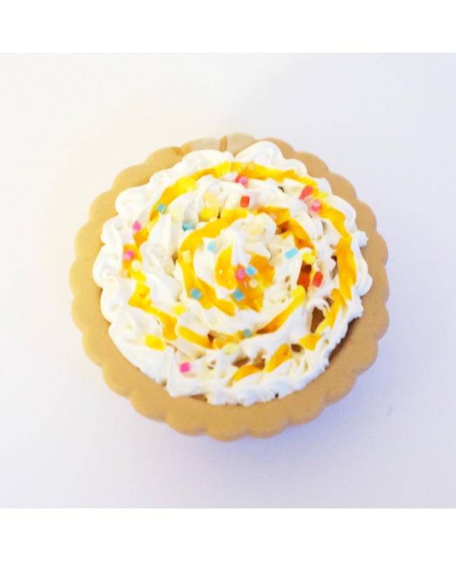 Little tart made with polymer clay, with whipped cream, orange coulis and little multicolored sprinkles.