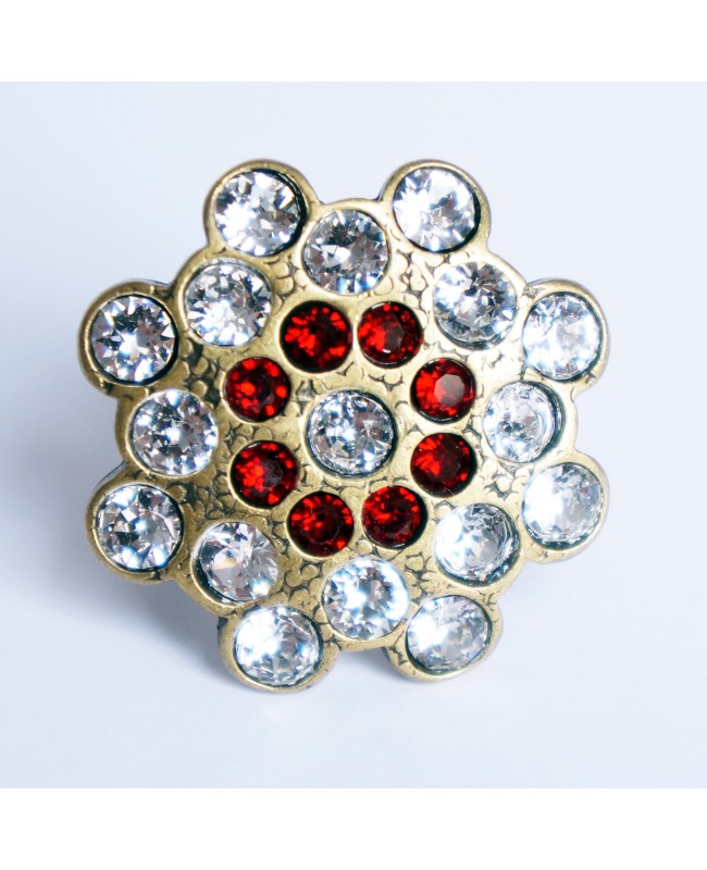 If you like glitzy diamante jewelry, you will love this beautiful ring, made with red and white Swarovski crystals. The bronze ring part is adjustable and the diamantes were added by hand in our workshop.