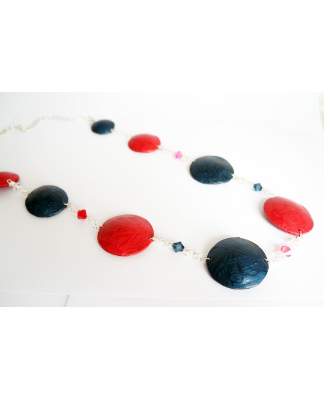 Handcrafted, this is a unique creation. This long red and blue necklace was made entirely by hand and you won’t find one anywhere else. These round flat beads were made by us using polymer clay. The beads are a diameter of 4 cm, and although they are smooth they give the impression of being textured with abstract, original and modern patterns. Each bead is separated by a metal spacer which features Swarovski crystal seed beads (butterfly and bicones). The sautoir necklace is finished with a metal silver-colored chain.