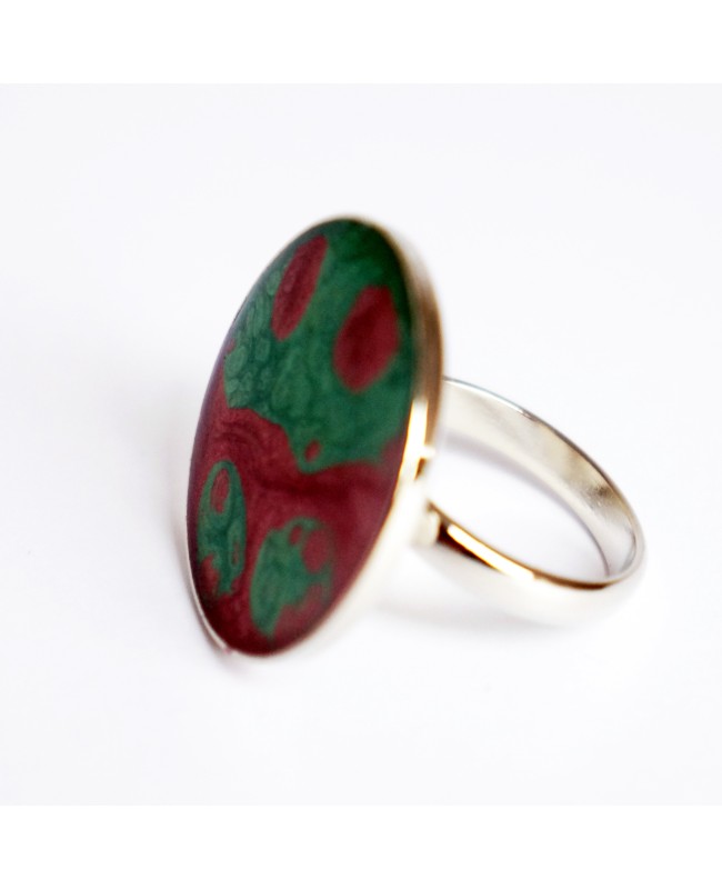 This red and green ring will have you in a spin! A unique, chic whirlwind is brewing thanks to this handmade fashion piece. The paint combines to make random whirlwind patterns, which means that each ring is unique and cannot be reproduced identically. If you are not yet convinced by this ring, you will be charmed by its price and adjustable size.