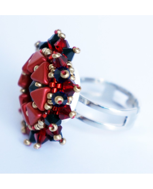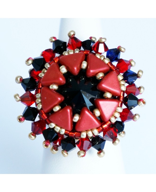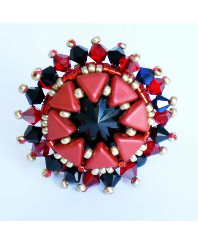 Its discreet yet striking colors come into their own when the light strikes the Swarovski crystal spinning top beads. The resulting sparkle on the ring enhances the combination of red and black. The middle black cabochon is made from Swarovski crystal. Each bead is threaded and attached by hand.