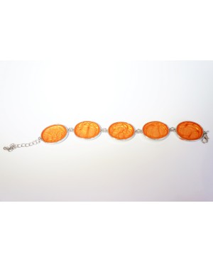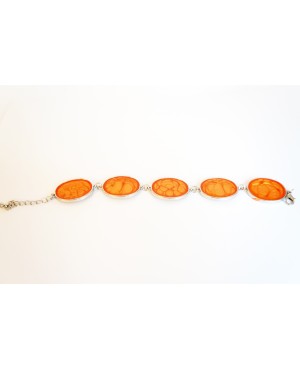 This orange bracelet is perfect for all those who like to wear bright colors on their wrist. The orange part is made using paint in our workshop then attached to a silver metal base. The scales that form are random, thus making each bracelet a unique piece. To protect the whole thing, we have added a layer of resin on top.