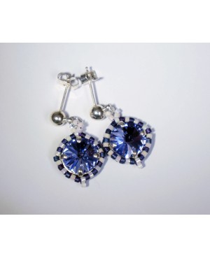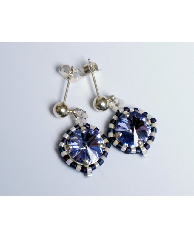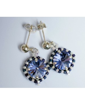 Ce bijou fantaisie entièrement fabriqué à la main à partir de matériaux de qualité. Cette paire de boucles d'oreilles bleues et blanches a été réalisée à partir d'un cabochon en cristal serti de délicas bleus et blancs. De faible diamètre, il reste discret et son poids plume en fait un bijou très facile à porter. Enfin, son prix tout doux en fait un cadeau idéal!