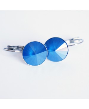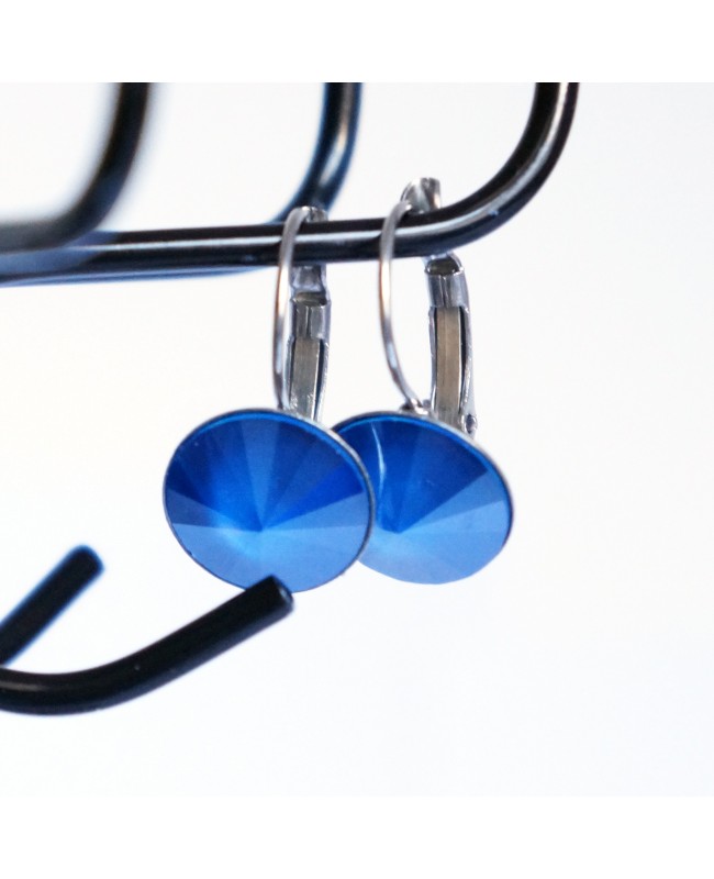 With a diameter of 13 mm, these blue earrings are very easy to wear. These drop earrings will suit blonds, brunettes and red heads! These gorgeous earrings reveal their full sparkle under the light, as the cabochons are made from Swarovski crystal. These earrings, featuring crystals from the 2017 Swarovski Spring/Summer collection, reveal bright blue sparkles in the light.