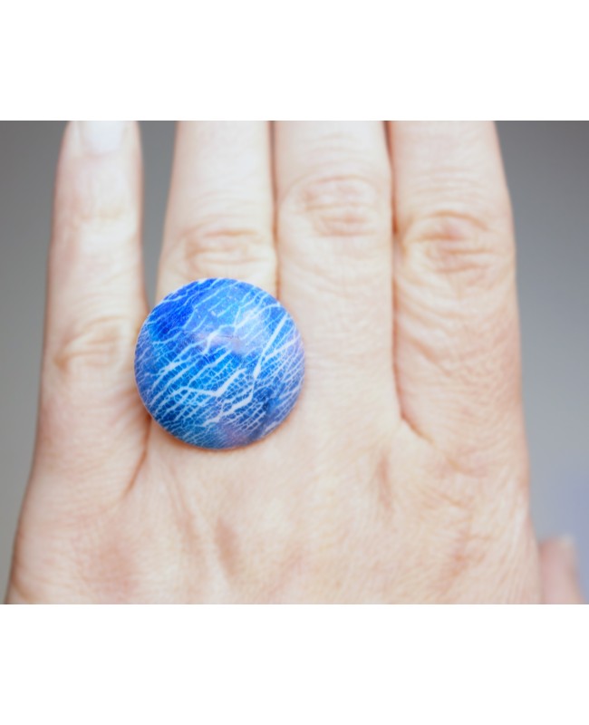 This unique handcrafted blue ring is exclusively available on our website. What makes this costume ring unique is the upper part which has been made in our workshop In designing this blue cabochon, silver leaf and alcohol inks (in blue, purple and turquoise) have been delicately mounted on white polymer clay.Polymer clay is a modelling material that hardens when baked.The results in a lightweight and hardwearing product. What’s more, the use of silver leaf and alcohol inks result in a luminous finish with a metallic sparking effect when it catches the light. It also has a crackle finish which sets off the white polymer clay perfectly.