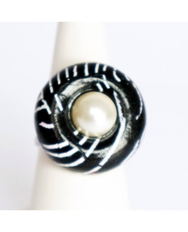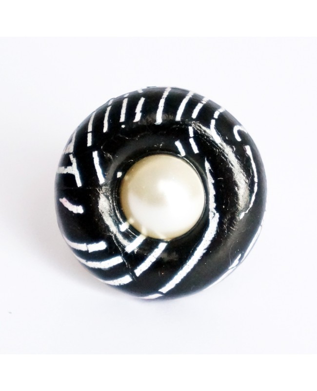 This black ring with white traces and a mother-of-pearl cabochon in the center and a 3cm diameter. The upper part was made by hand and was attached to an adjustable silver mount. On each side of the cabochon, the white stripes are irregular and bring a touch of originality to the ring.