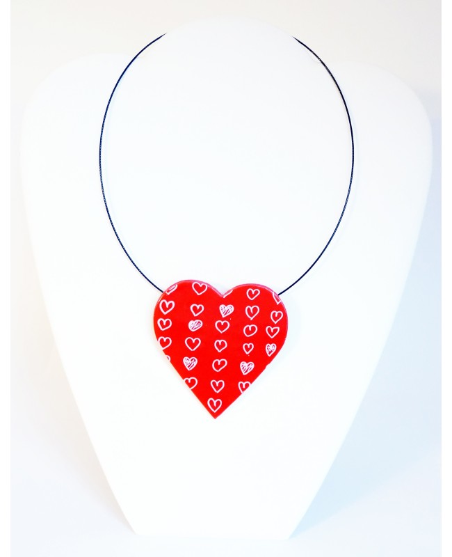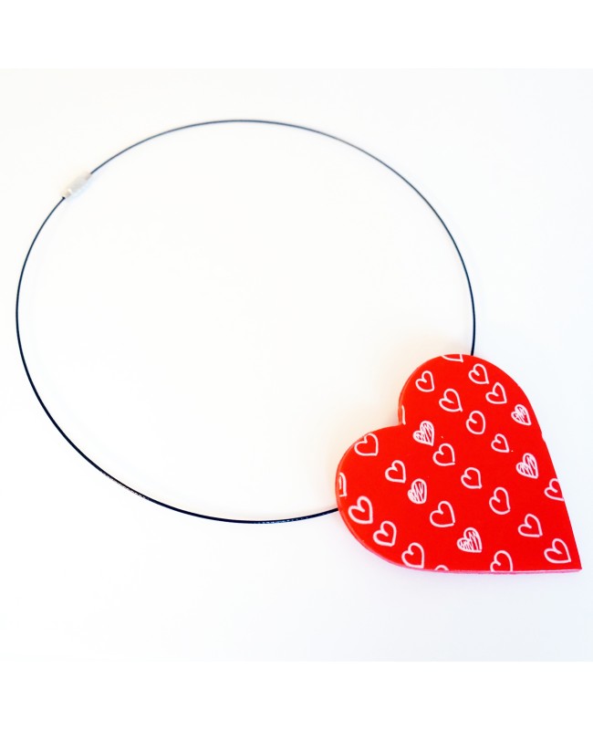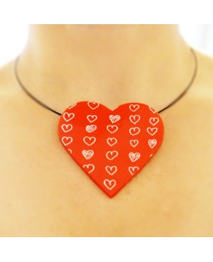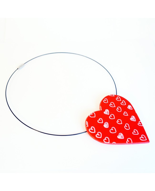 This very big red heart pendant with little painted white hearts was entirely handmade in our workshop. It's made from polymer clay and can be paired with a big or small ring.