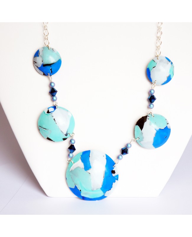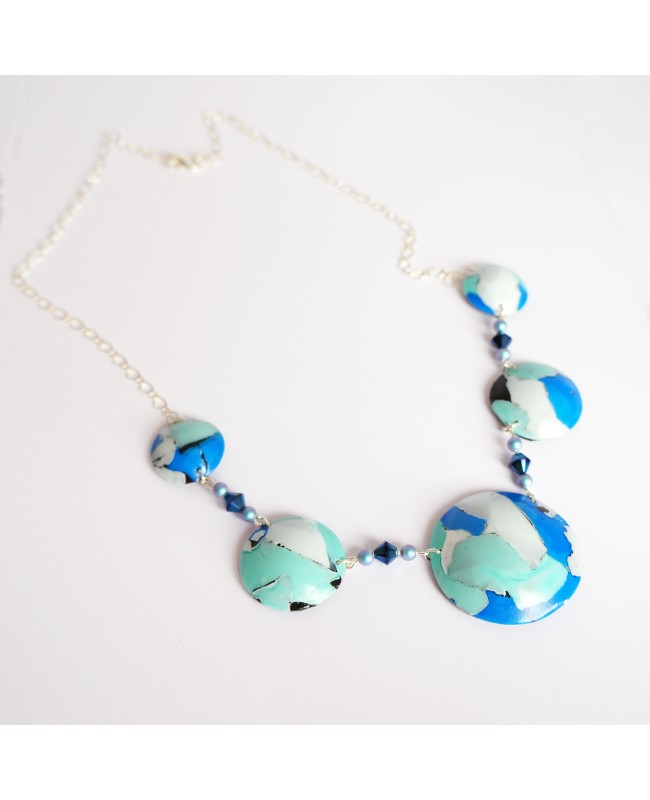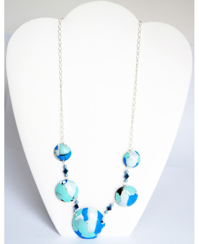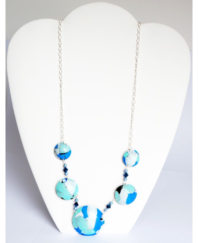 Modernity and blue, white and turquoise colors come to your home with this 100% handmade necklace. Its advantages?Round and flat beads made entirely by hand from polymer clay.The central piece has a 4 cm diameter and is resistant and light to wear. Between each disc, we added spinning tops and beads made from Swarovski crystal. A silver chain finishes this unique and original piece.