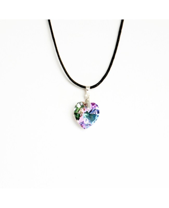 This pretty pink pendant plays with light to reveal a unique and multicolored transparency.It is high quality as it as a Swarovski crystal heart.It has a width of 18 mm and a height of 15 mm and was made by hand in our workshop.It is then attached to a silver suspension ring which is attached to a black cotton cord.This pendant is worn as a choker as the chord is 42 cm.