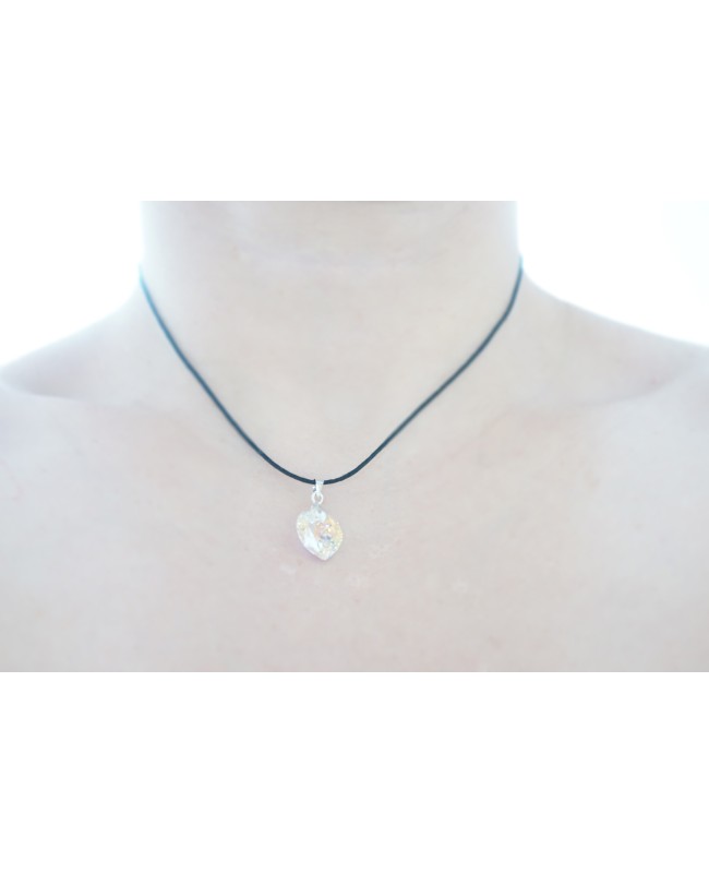 This petite, precious pendant sparkles beautifully under the light. It is a heart-shaped pendant made from crystal. This pendant is 18mm wide and therefore small and discreet. This small transparent heart can change color depending on the light and becomes multicolored. It is attached to a 42cm-long black cotton cord. It is therefore worn as a choker.