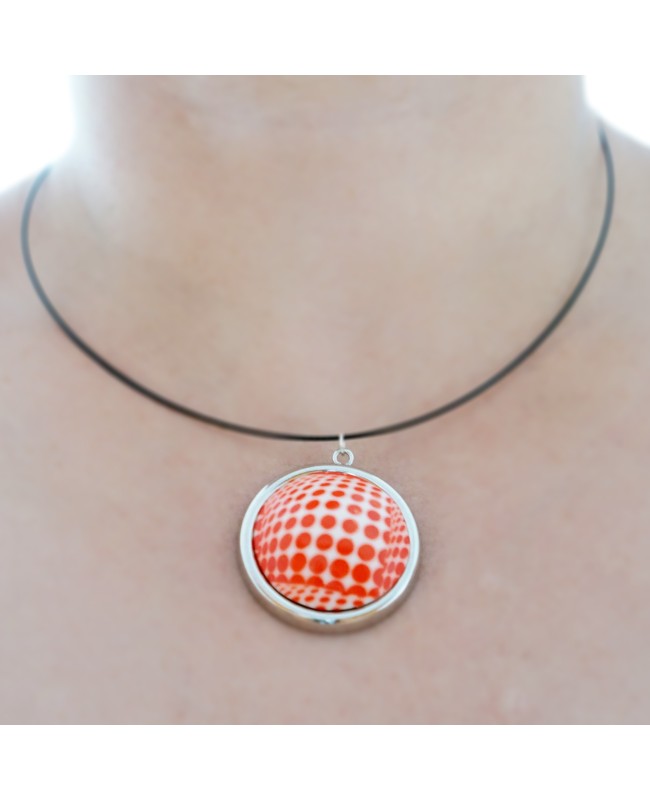 Optical effect and a throwback to the 70s is guaranteed with this pendant with red polka dots. Between square and curved, you'll love the vintage side of this choker necklace. The red and white decorative head was designed in our workshop and has a diameter of 4 cm.