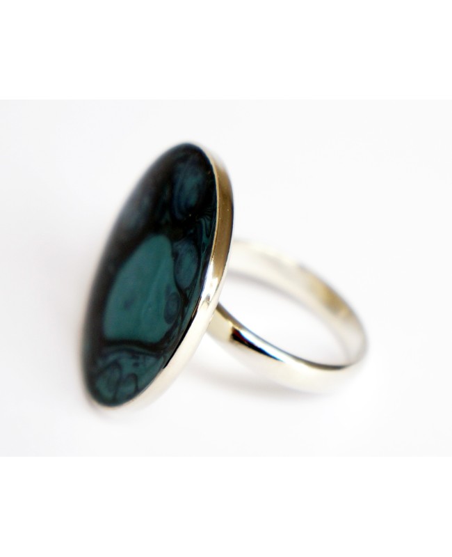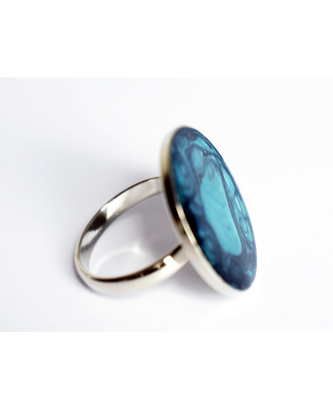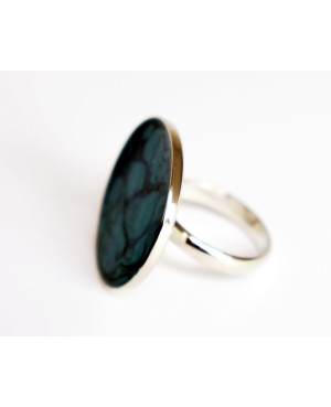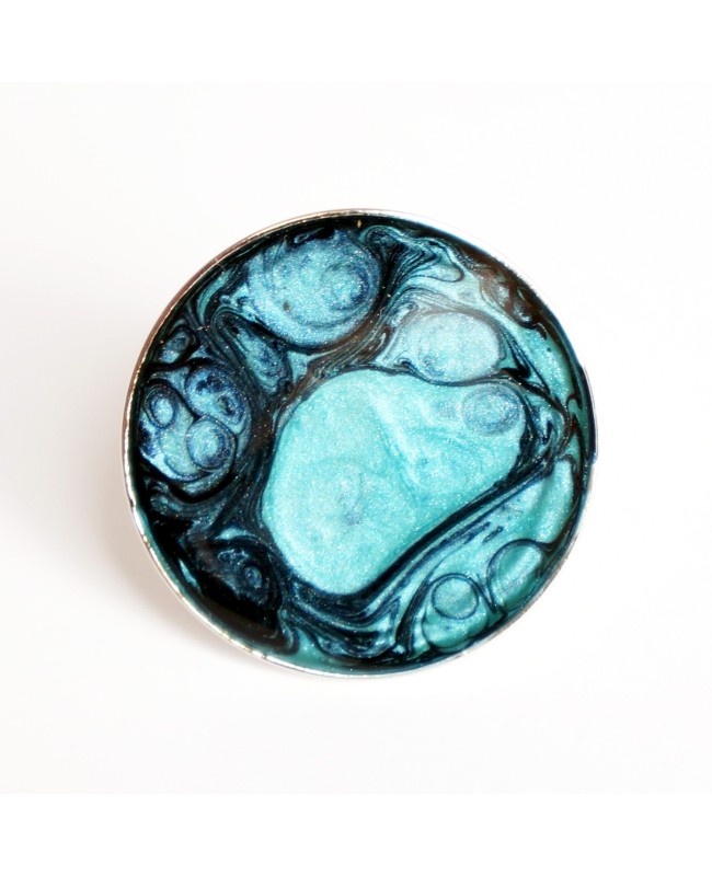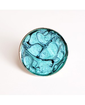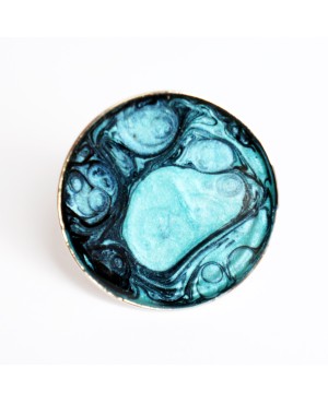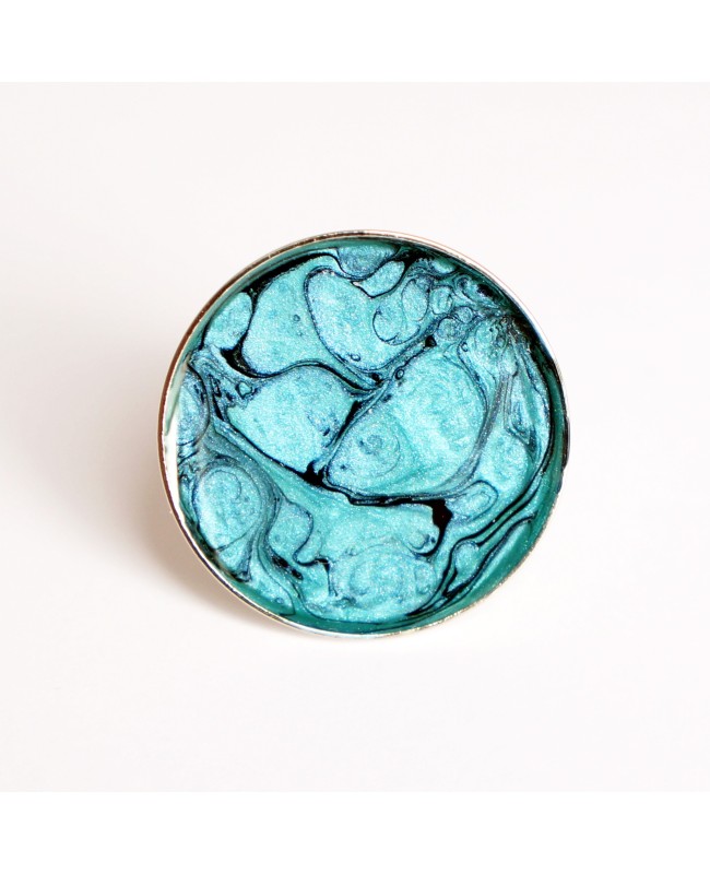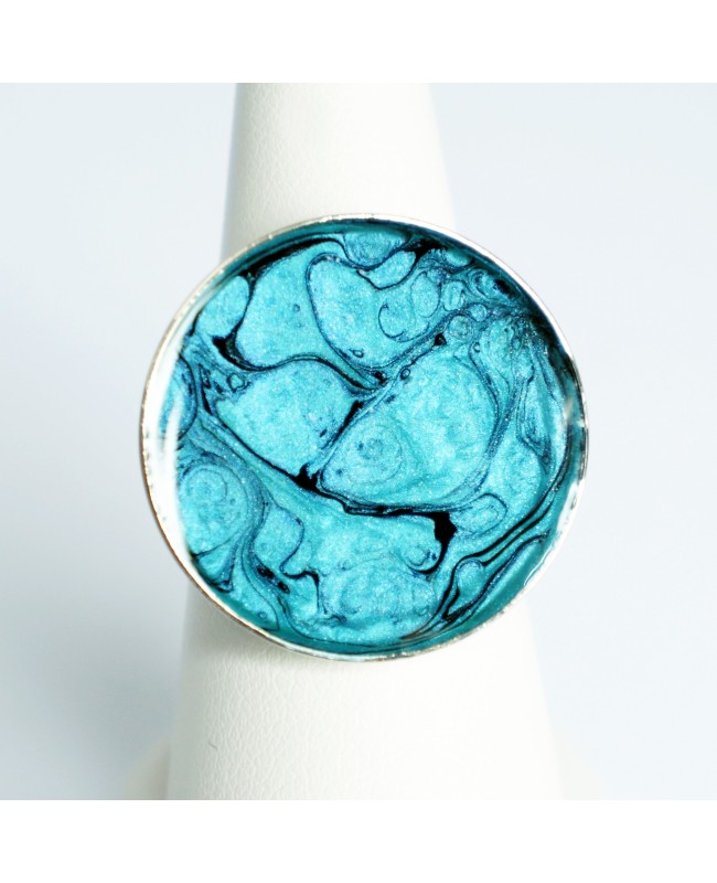 Originalité et modernité pour cette bague réalisée à partir de peinture noire (céramique) et turquoise (prisme). Afin de protéger la peinture et apporter de la brillance à ce bijou, une couche de résine a été ajoutée. Le support de la bague est en métal argenté et ajustable.