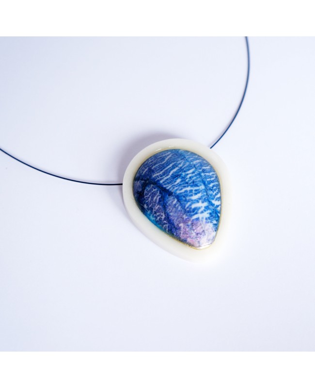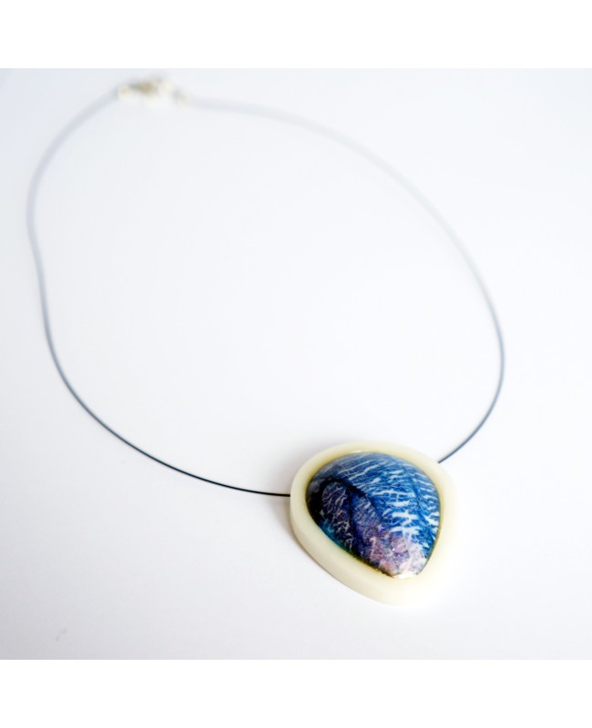 This necklace is 100% handmade with the pendant designed by us in our workshop. It’s made from polymer clay which guarantees that it is hard wearing, solid and long lasting while still being easy to wear and light. Blue, white with a hint of pink/purple, metallic reflections appear in sunlight. This jewel thus becomes bright and very original.