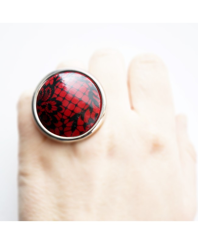 Femininity is limitless with this red and black ring which perfectly recreates lace. With a diameter of 4 cm, this ring is easy to wear as you can adjust the size so it fits your finger perfectly. The red decorative head is made entirely by us in our workshop.