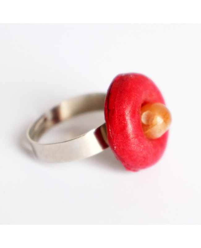 This isn’t a cake but a ring 100% handmade in our workshop. The decorative head, with a diameter of 2 cm, was designed with care and attached to an adjustable ring support. The upper part, made from polymer clay, is in the shape of a red donut. Iridescent reflections give it more originality and depth. A glass orange pearl was added to the center of this donut.