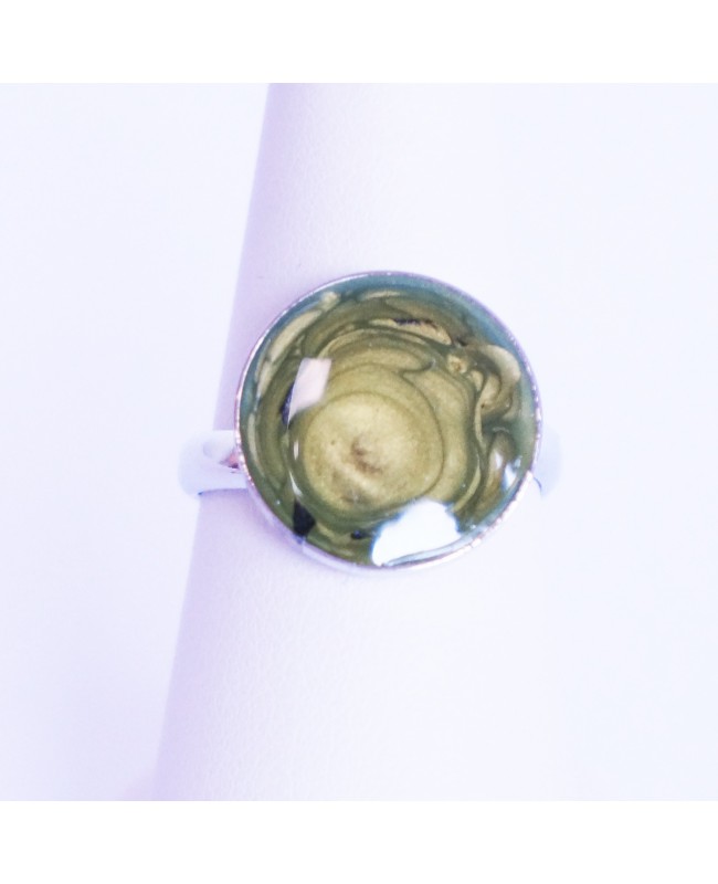 This small green ring was made by hand in our workshop using paint. This paint forms a circle pattern at random. Each ring is therefore unique and inimitable. A layer of resin has been added to protect the paint. Finally, the silver-plated ring part is adjustable. You can therefore change the size of your ring whenever you want.