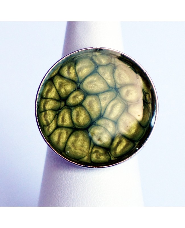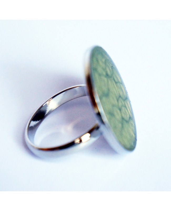 It has a diameter of 2.5 cm, is green and looks like a tortoise shell. With an effect which imitates scales, this one-of-a-kind ring will be a hit for several reasons. Firstly, it is made by hand, and the silver-plated ring part is adjustable. There’s no issue with size as it can be adjusted to perfectly fit your finger! You will also love the reasonable price of this artisan creation.