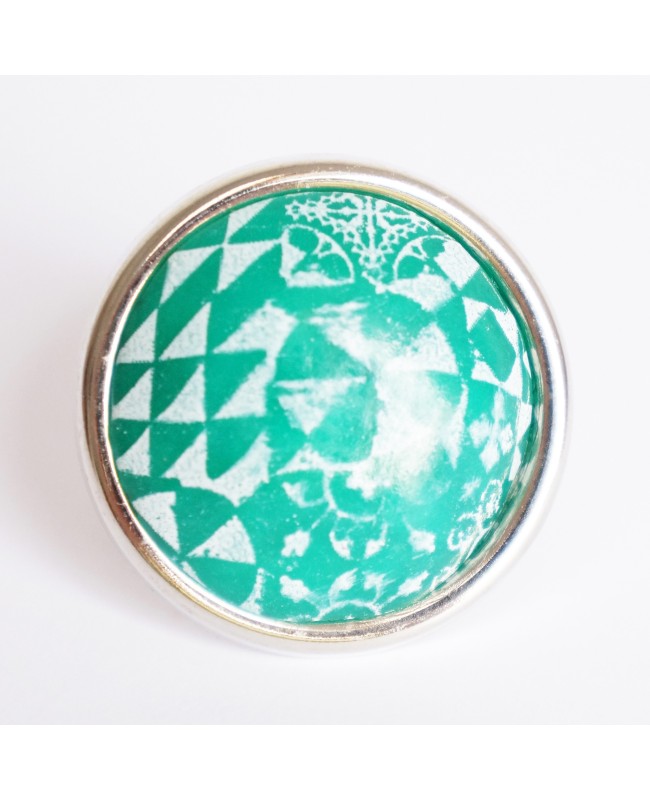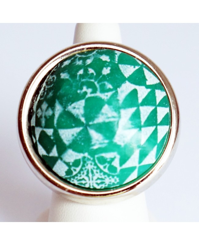 Escape is on the horizon with this adjustable, 100% handmade ring. With a 4 cm diameter, the decorative head of this fashion jewelery ring was made in our workshop from green polymer clay. A white azulejos pattern is then added and is reminiscent of the earthenware tiles which decorate Portuguese walls. Everything is secured to an adjustable silver-plated ring support. So why wait any longer to escape on holiday all year round?