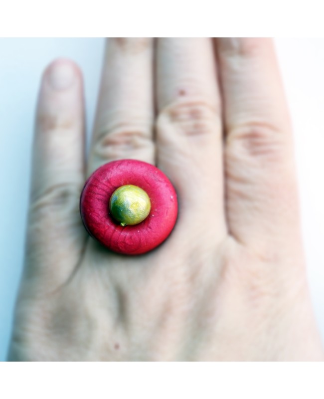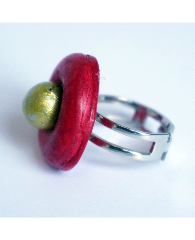 Completely handmade, this ring will surprise you with its vibrant colors and originality. The cabochon, with a diameter of 2.5 cm, was crafted by us and attached to an adjustable ring base. The upper part, made of polymer clay, has the shape of a red donut. Iridescent highlights and delicate patterns give it even more texture and depth. A yellow polymer clay pearl has also been added to the center of this donut.