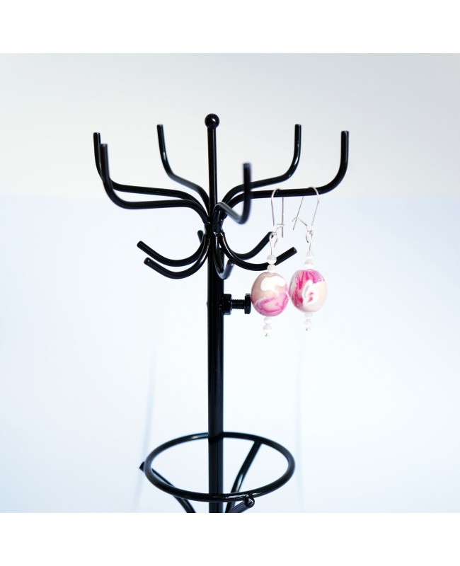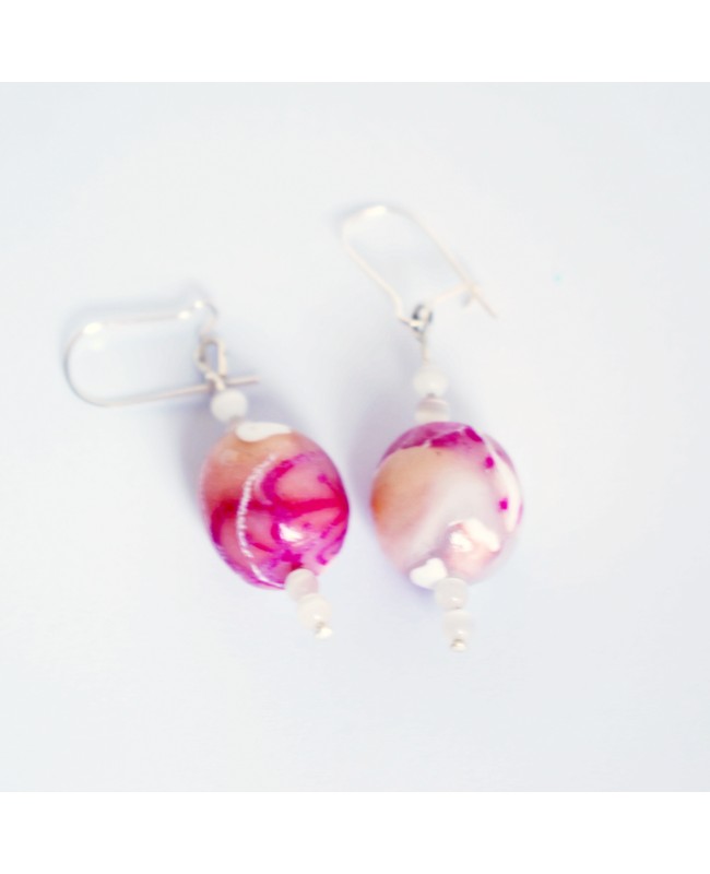 These earrings play with transparency with pink patterns that appear and merge with beige and white. With a total length of 5 cm, the main beads were made in our workshop from polymer clay. They measure 1.5 cm and are surrounded by small white beads.
