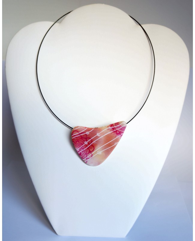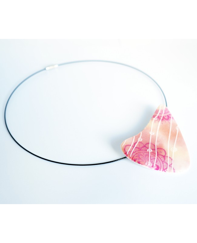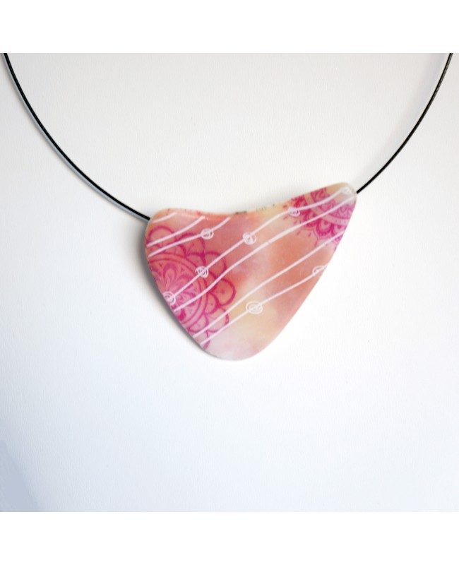 Take a little journey to Asia with this entirely handcrafted choker necklace. On a base of white polymer clay, shades of beige and pink have been added. To infuse some color, vibrant pink mandala motifs are incorporated. Lastly, to complete the ensemble and bring a touch of modernity and originality, white lines accompanied by small circles complement the design. The unique feature of this pendant? Its original shape! A sleek triangular form that gives it a distinct and modern look. Finally, it is attached to a black steel wire choker. The pendant has a screw-on mechanism.