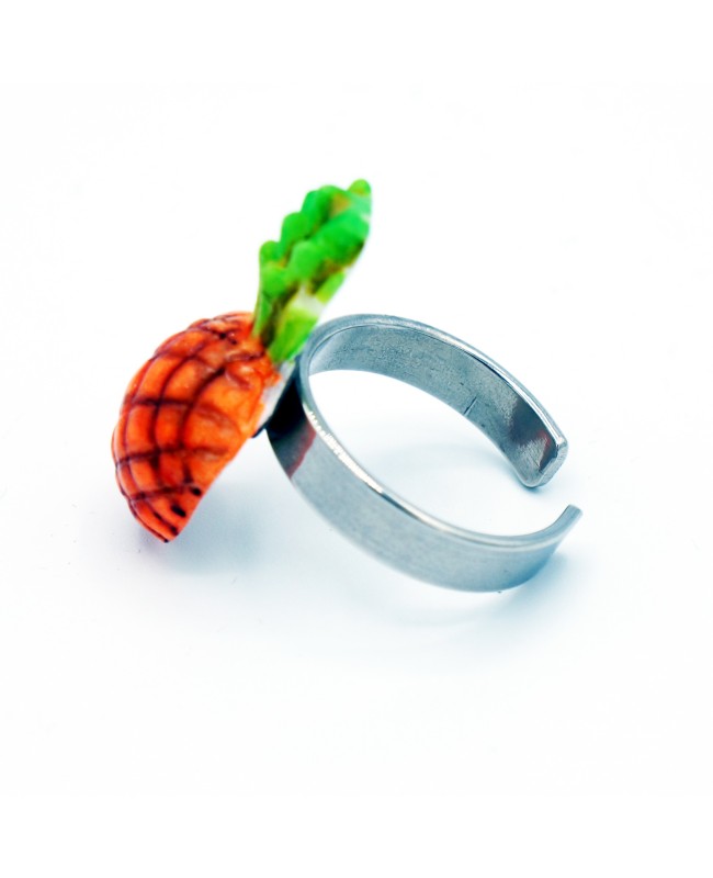If you want to add a touch of exoticism to your costume jewelry, now is the time to treat yourself with this 100% handmade ring. The pineapple was crafted by us from white polymer clay. We then colored the entire piece with alcohol markers and protected it with clear varnish. This miniature was then attached to a silver metal ring base. The advantage is that you can adjust the size of this base and thus customize the ring to your size.