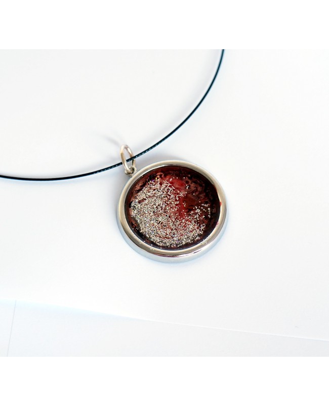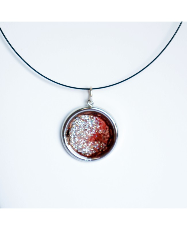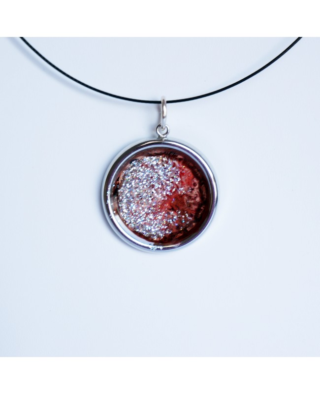 A touch of glitter and festivity for this 38 mm pendant. On a swirl-effect pink paint base, we've added glitter to give it a festive and childlike touch. The entire piece is protected by a layer of resin that enhances the texture and the light. The round base is made of silver-toned metal and is attached to a black wire cable choker.