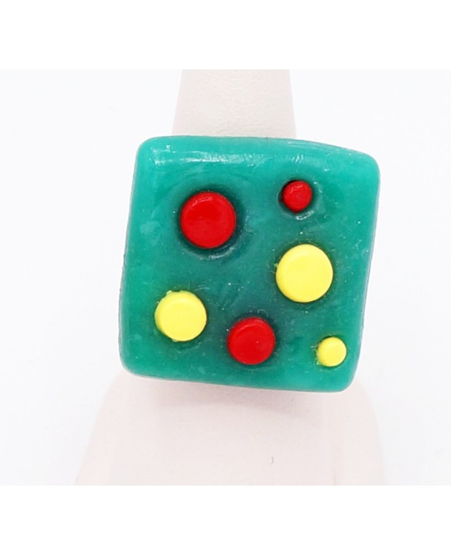 This green ring with red and yellow polka dots will add a pop of color to your hand. The vibrant colors will bring a touch of cheerfulness to your day, and you'll appreciate the practicality of this ring since the size is adjustable. The square part measures 2.5 cm and has been crafted from polymer clay.