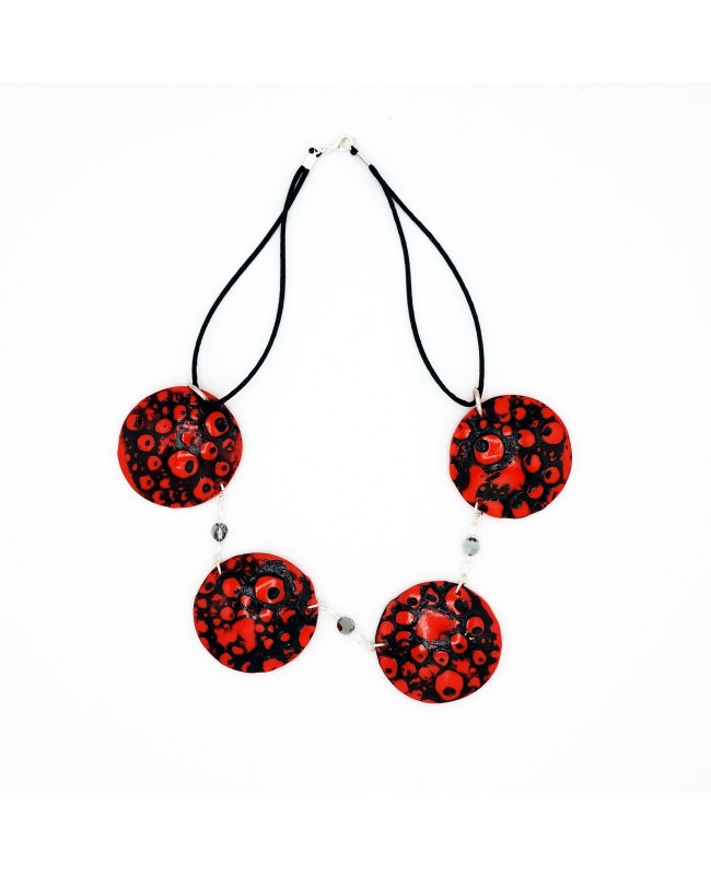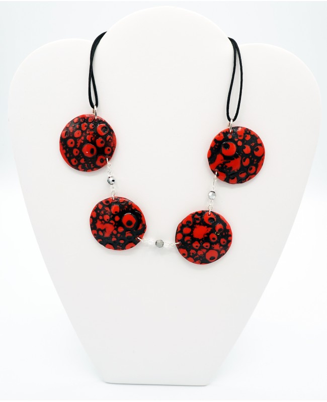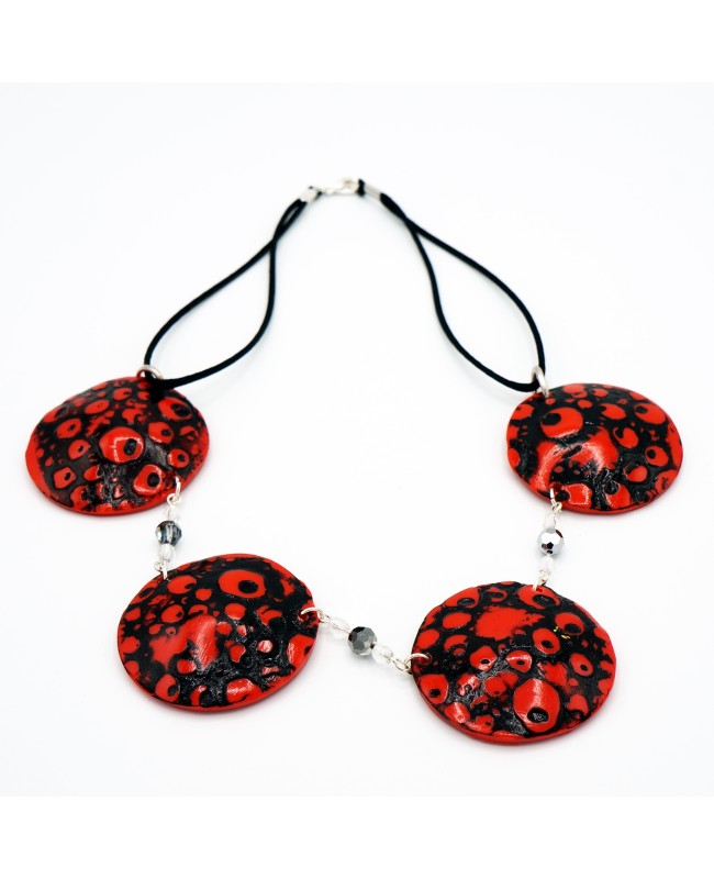 The red and black polymer clay beads were crafted by us using polymer clay. They feature a slight relief on their surface, and the black paint highlights the 'globules' effect. Between each round, flat red bead, silver and transparent faceted crystal beads from Swarovski have been added. This combination of beads adds reflections to the overall design, giving it a chic and classy appearance. The ensemble is finished with a fine black satin cord and a simple silver-tone metal clasp.