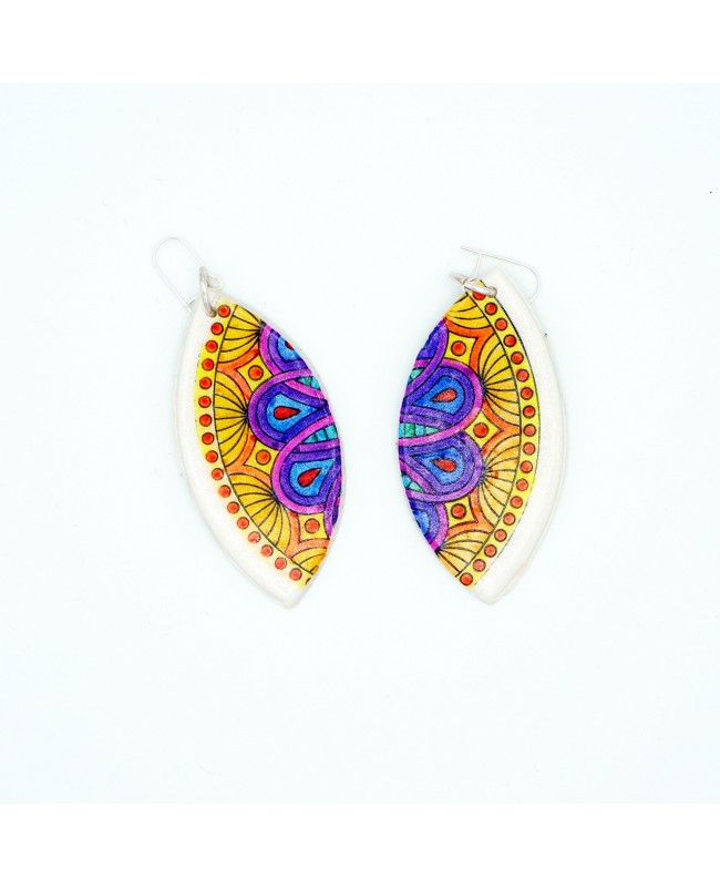 These earrings are very large, with a total length of 8.5 cm. They were crafted on a slightly glittery white polymer clay base. A mandala pattern was then added, and each piece was colored with alcohol inks. The whole piece was varnished for added protection. The earring hooks are made of silver-tone metal.