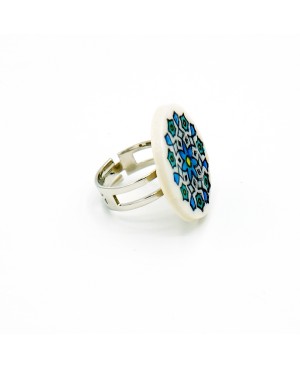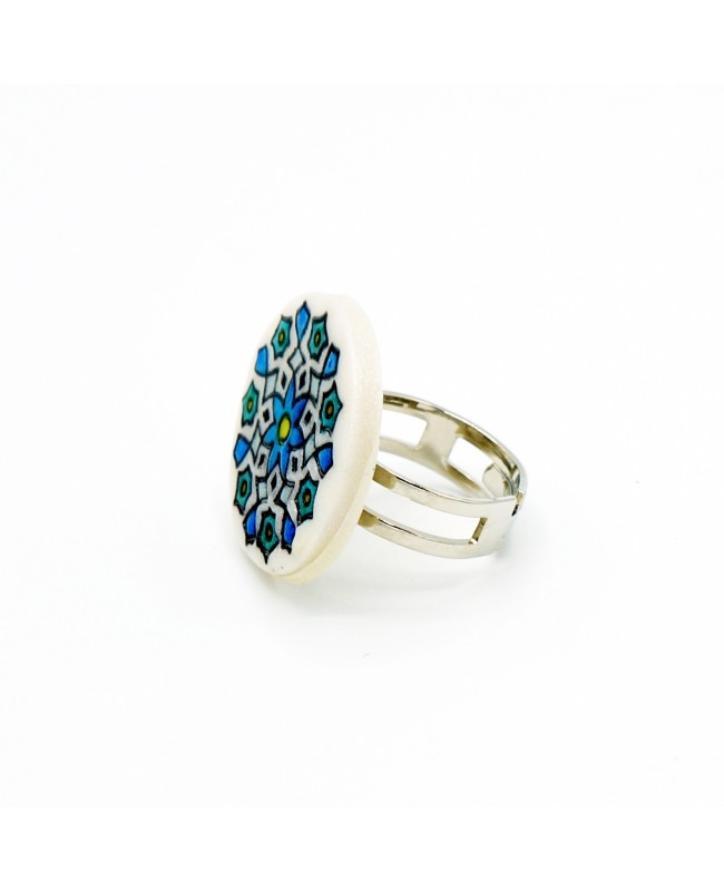Continuing our journey through Asia, we present this adjustable mandala ring. With a diameter of 2.7 cm, the white polymer clay cabochon showcases vibrant and unique colors in the form of a mandala pattern. For this ring, the dominant colors are blue and turquoise. Light and comfortable to wear, it is available as a unique piece.
